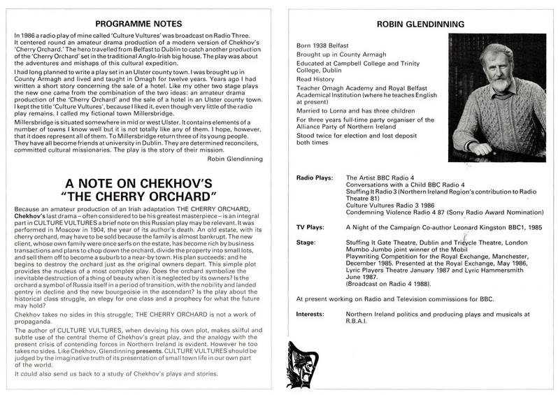 A founding member of the Alliance Party, Robin was also a playwright, a prolific writer of radio plays, short stories, and a number of stage plays for theatre. The Lyric produced two of Robin’s plays - the Irish premier of his award-winning play ‘Mumbo Jumbo’ in 1987, and premier of ‘Culture Vultures’ in 1988. The Linen Hall theatre archives have digitised the programmes for both productions: